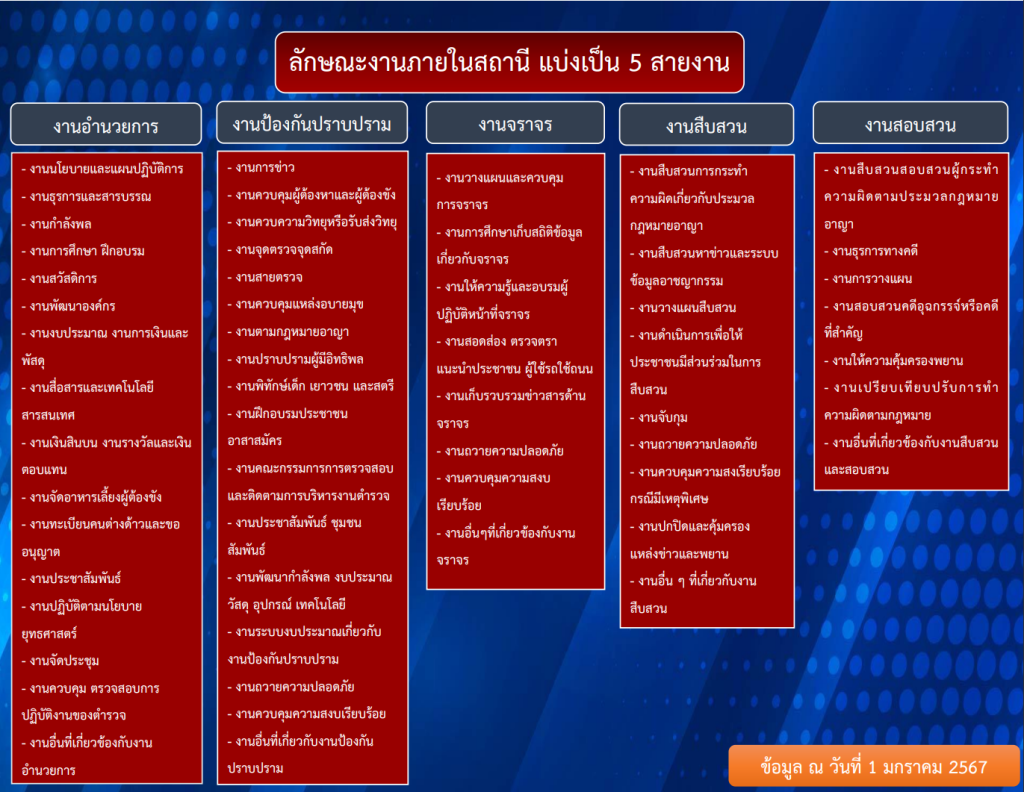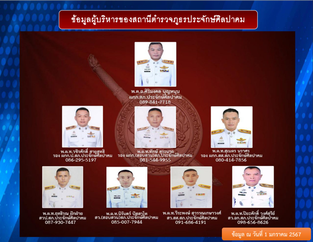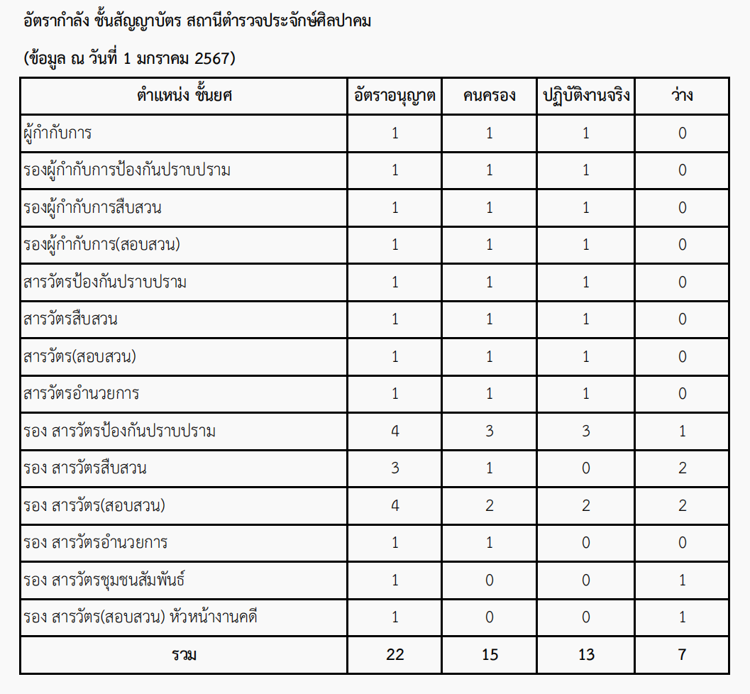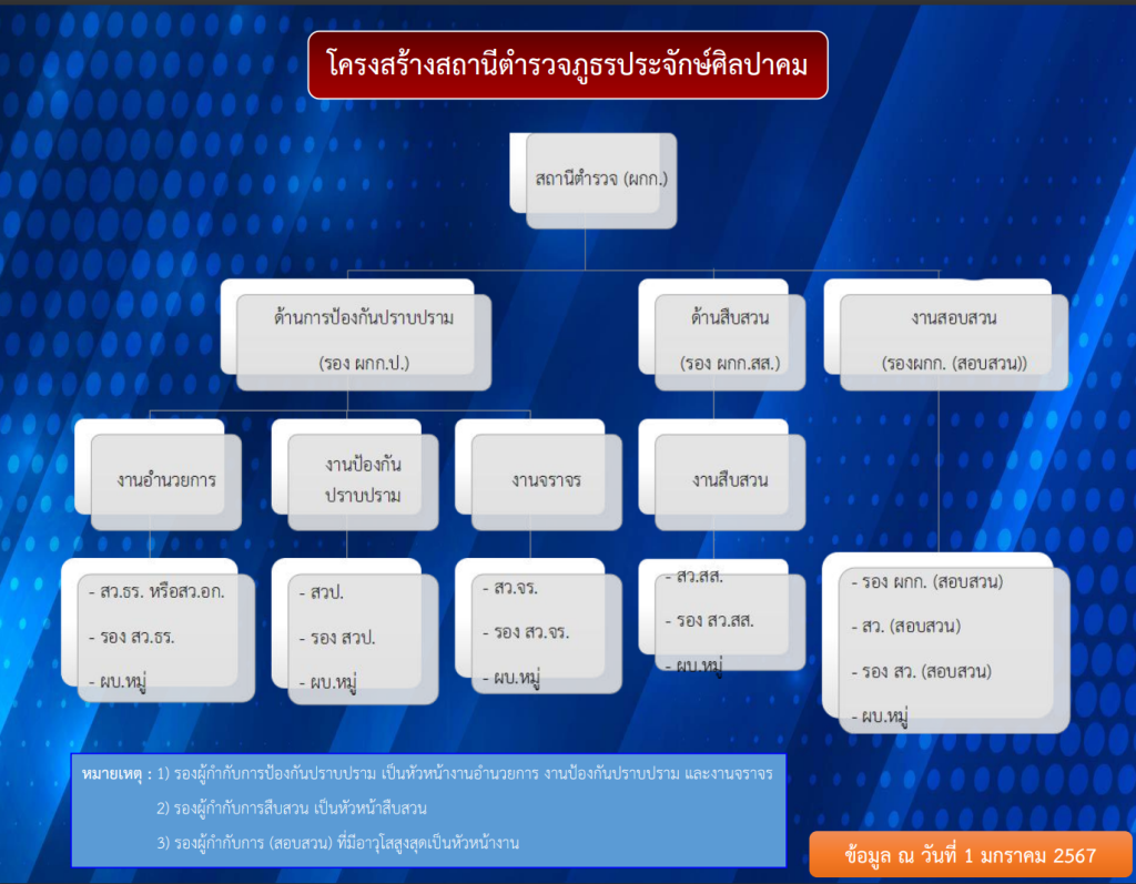 O1 โครงสร้าง อัตรากำลัง และข้อมูลผู้บริหาร 4 ธันวาคม 2023 โดย admin / ไม่มีหมวดหมู่ แผนผังโครงสร้างการแบ่งส่วนราชการของสถานีตำรวจภูธรประจักษ์ศิลปาคม (Organization Charts) อัตรากำลังของสถานีตำรวจภูธรประจักษ์ศิลปาคม ข้อมูลผู้บริหารของสถานีตำรวจภูธรประจักษ์ศิลปาคม