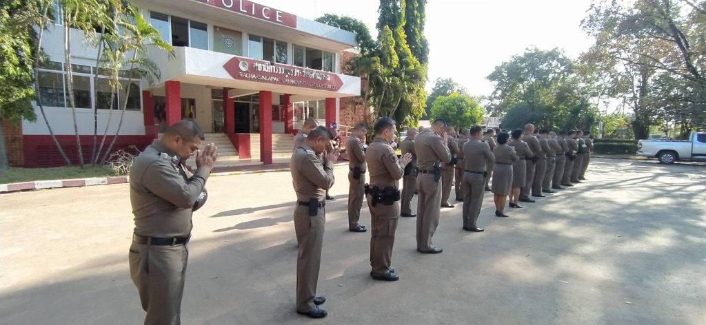 9 ม.ค.67 เวลา 09.00 น. พ.ต.อ.ศิริมงคล บุญหนุน ผกก.สภ.ประจักษ์ศิลปาคม , พ.ต.ท.วชิรศักดิ์ สายสุทธิ รอง ผกก.ป. สภ.ประจักษ์ศิลปาคม , พ.ต.ท.ทักษ์ สุระนาถ รอง ผกก.(สอบสวน) สภ.ประจักษ์ศิลปาคม , พ.ต.ท.ฤทธิรณ ฝักฝ่าย สวป. สภ.ประจักษ์ศิลปาคม ,พ.ต.ท.นิรันดร์ ปัสสาโท สว.(สอบสวน) สภ.ประจักษ์ศิลปาคม , พ.ต.ท.วีระพงษ์ สุวรรณเกษาวงศ์ สว.สส. สภ.ประจักษ์ศิลปาคม ,พ.ต.ท.ปิยะศักดิ์ วงศ์สุรีย์ สว.อก. สภ.ประจักษ์ศิลปาคม พร้อมข้าราชการตำรวจ สภ.ประจักษ์ศิลปาคม ร่วมเข้าแถวเคารพธงชาติ สวดมนต์ไหว้พระ กล่าวบทปลงใจ/กล่าวคำสัตย์ปฎิฎาณ/อุดมคติตำรวจ ตรวจเครื่องแต่งกาย/ทรงผม มอบหมายภารกิจประจำวันฯ พร้อมชี้แจงแนวทางการปฏิบัติตามข้อสั่งการตามนโยบายของผู้บังคับบัญชา โดยให้ยึดถือและปฏิบัติตามอย่างเคร่งครัด