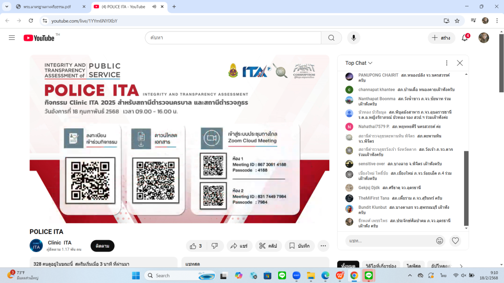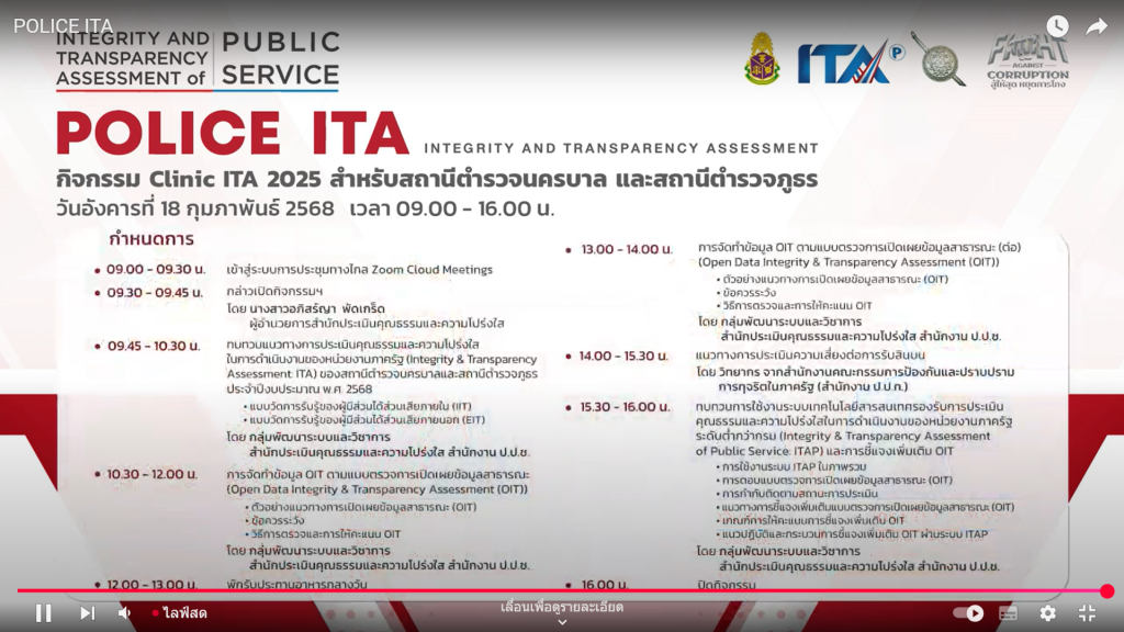 18 ก.พ.2568 เวลา 09.00 น. พ.ต.อ.ศิริมงคล บุญหนุน ผกก.ฯ มอบหมายให้ ส.ต.ต.ธีรพงศ์ เพชรไพร ผบ.หมู่ ฯ ร่วมกิจกรรม Clinic ITA 2025 สำหรับสถานีตำรวจนครบาล และสถานีตรวจภูธร โดยมี นางสาวอภิสร์ญา พัดเกร็ด ผู้อำนวยการสำนักประเมินคุณธรรมและความโปร่งใส เป็นผู้กล่าวเปิดกิจกรรมฯ